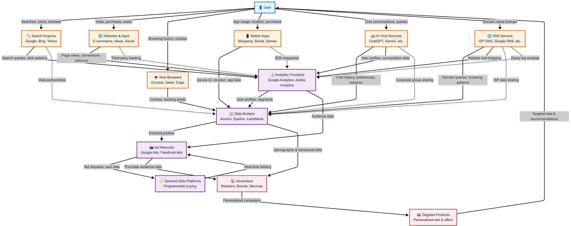 This system operates on a simple premise: the more they know about you, the more valuable you become as a product to be sold to advertisers, political campaigns, and other entities seeking to influence your decisions. Your searches reveal your fears and desires, your clicks show your preferences, and your conversations expose your thoughts. Even your DNS queries—the fundamental requests that translate website names into IP addresses—are logged and analyzed by many providers, creating a complete map of every website you visit. All of this data flows through complex networks of analytics providers, data brokers, and advertising platforms, creating detailed profiles that often "know you better than you know yourself".